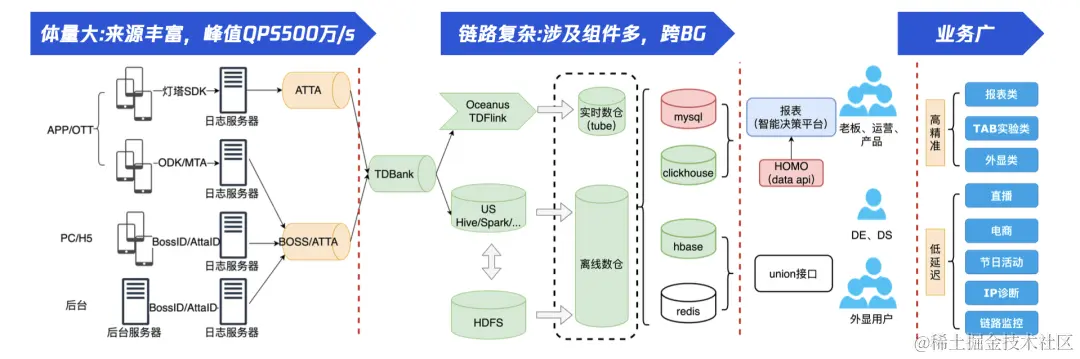 同时,因为腾讯是个庞大的组织,涉及到很多部门,各个部门又有各种各样不同的组件,导致我们在进行数据处理时,链路也会比较复杂。另一方面,我们面对的业务也比较广,包括给老板、运营、产品看的报表类数据,对外对接的 API 数据,以及通过接口调用给视频的终端能够外显给用户的数据。因此要求数据要精准,并且延迟要低,这对数据处理工作提出了很高的要求。