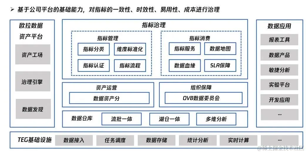 基于前文提到的业务背景和业界调研内容,我们设计了腾讯视频指标中台的整体架构,主要是基于公司平台的基础能力,通过指标中台对指标的一致性、时效性、易用性、成本进行治理。依赖公司数据平台提供的数据接入、任务调度、存储、统计分析、实时计算能力,建设相关的数据资产平台,包括数据的开发工具,引擎,数据的查找、发现、使用等工具。