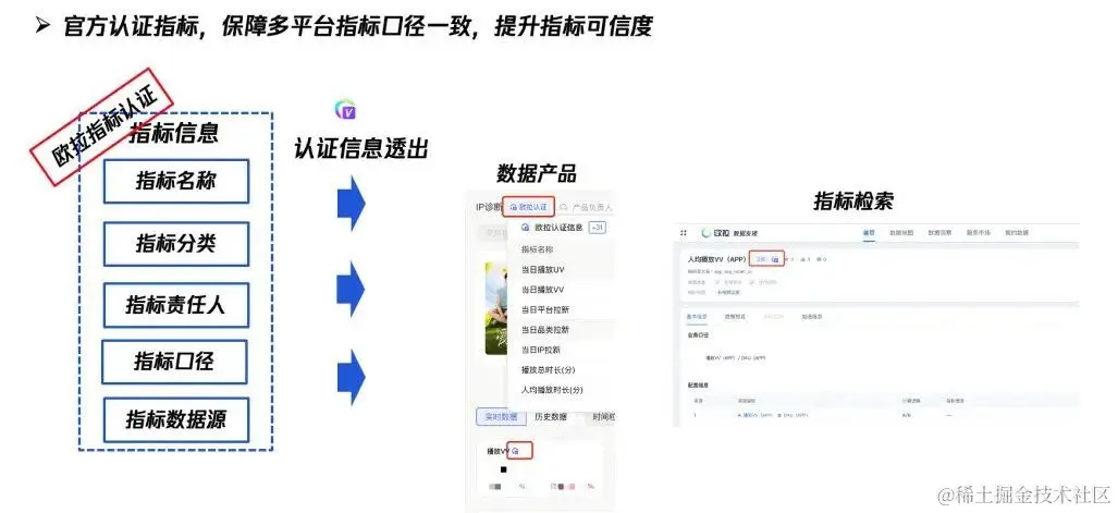 在指标一致性层面,我们对数据仓库中的指标做了官方认证,保障多个平台中的指标口径是一致的,提升了指标的可信度。指标认证部分,主要针对指标名称、指标分类、指标责任人、指标口径,以及指标的数据源信息做认证。经过认证的指标也能透传到相应下游的数据产品中。这依赖于指标的整个生产以及下游链路的打通。有了指标认证的标识,下游就可以放心地使用指标了。