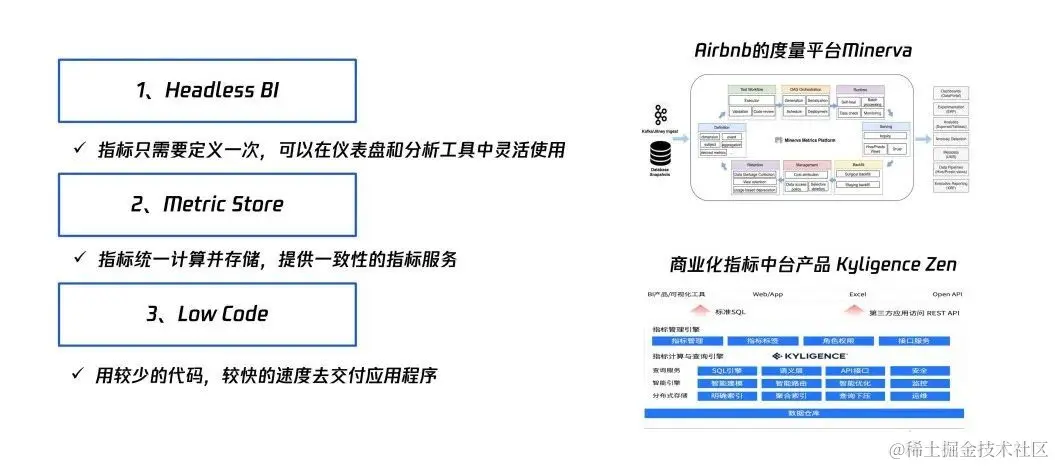 基于这些特性,我们调研了国内外指标中台的产品。比如说 Airbnb、Kyligence 以及国内快手、头条等相关的一些指标中台的产品。