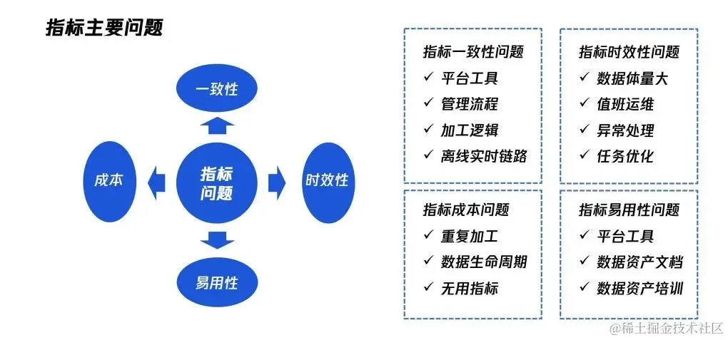 我们为什么要做指标中台?主要是要解决指标的治理问题,包括指标在使用或者生产过程中的一致性、时效性、易用性、成本的问题。指标一致性问题,主要来源于我们没有统一的平台来管理这些指标,指标的流程也不够规范,同一个指标的加工逻辑又不能保证是一致的。实时和离线会有不同的链路,也会导致指标的一致性问题和时效性问题。