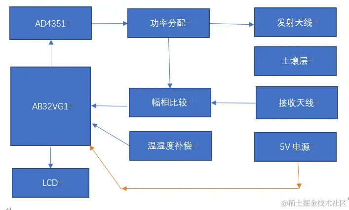 使用AB32VG1作为主控制器,配置高频产生电路产生900M高频信号,利用芯片自带的AD转换口采集幅相检测模块输出的模拟电压值。主控制器根据电磁波在土壤中和冬笋的反射介电常数不一样从而进行冬笋探测,并通过液晶显示。通过温湿度传感的补偿可以进一步提高测量精度。