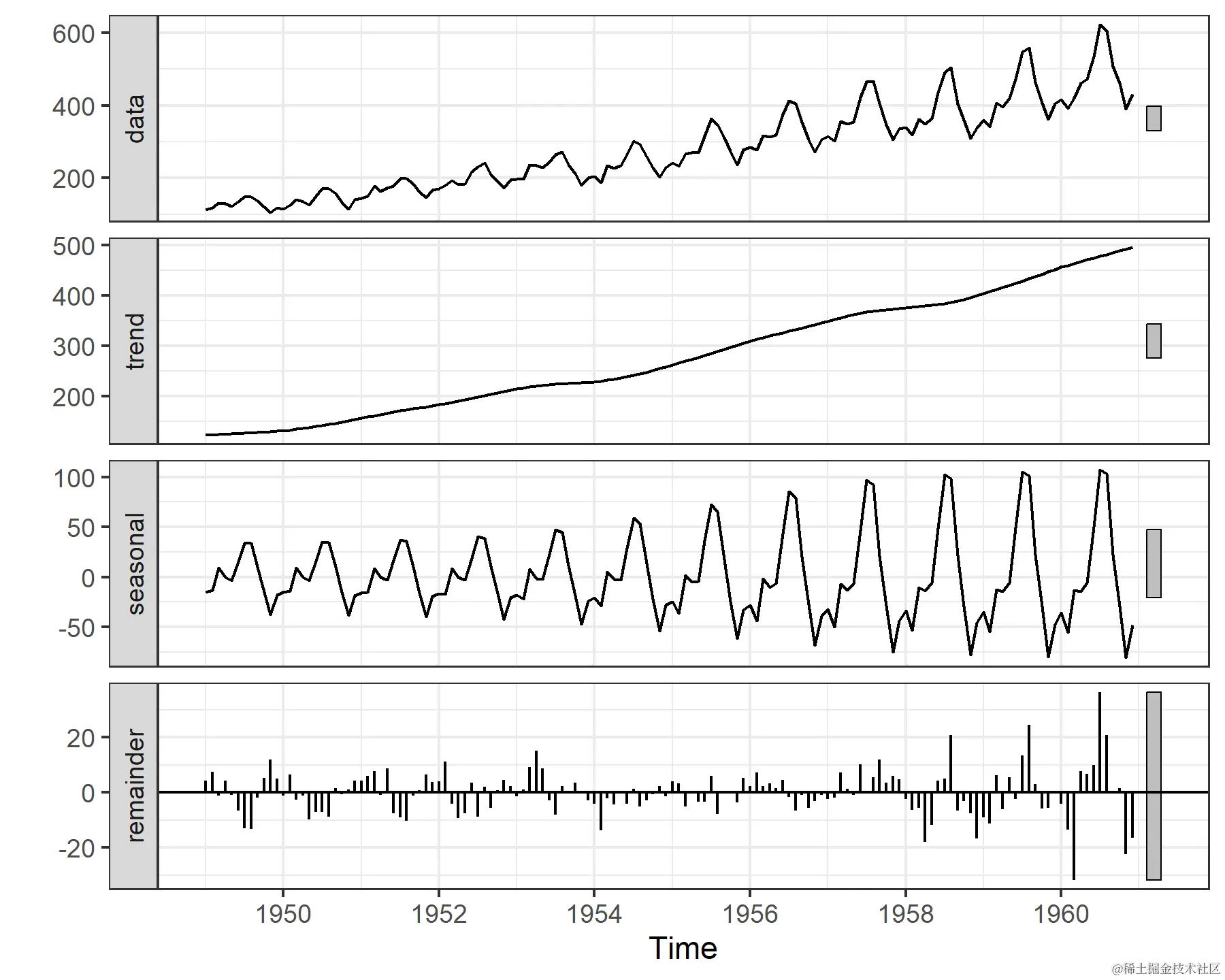 从这张图中可以清晰地看出,乘客数量存在强烈的季节性波动,但这种模式也似乎在随时间变化。一种常见的检查可能季节性模式的方法是计算和绘制STL分解(使用Loess的季节性和趋势分解),该方法利用Loess平滑来迭代地平滑和移除数据的某些成分(即可能是非线性的长期趋势和可能随时间变化的季节性)。