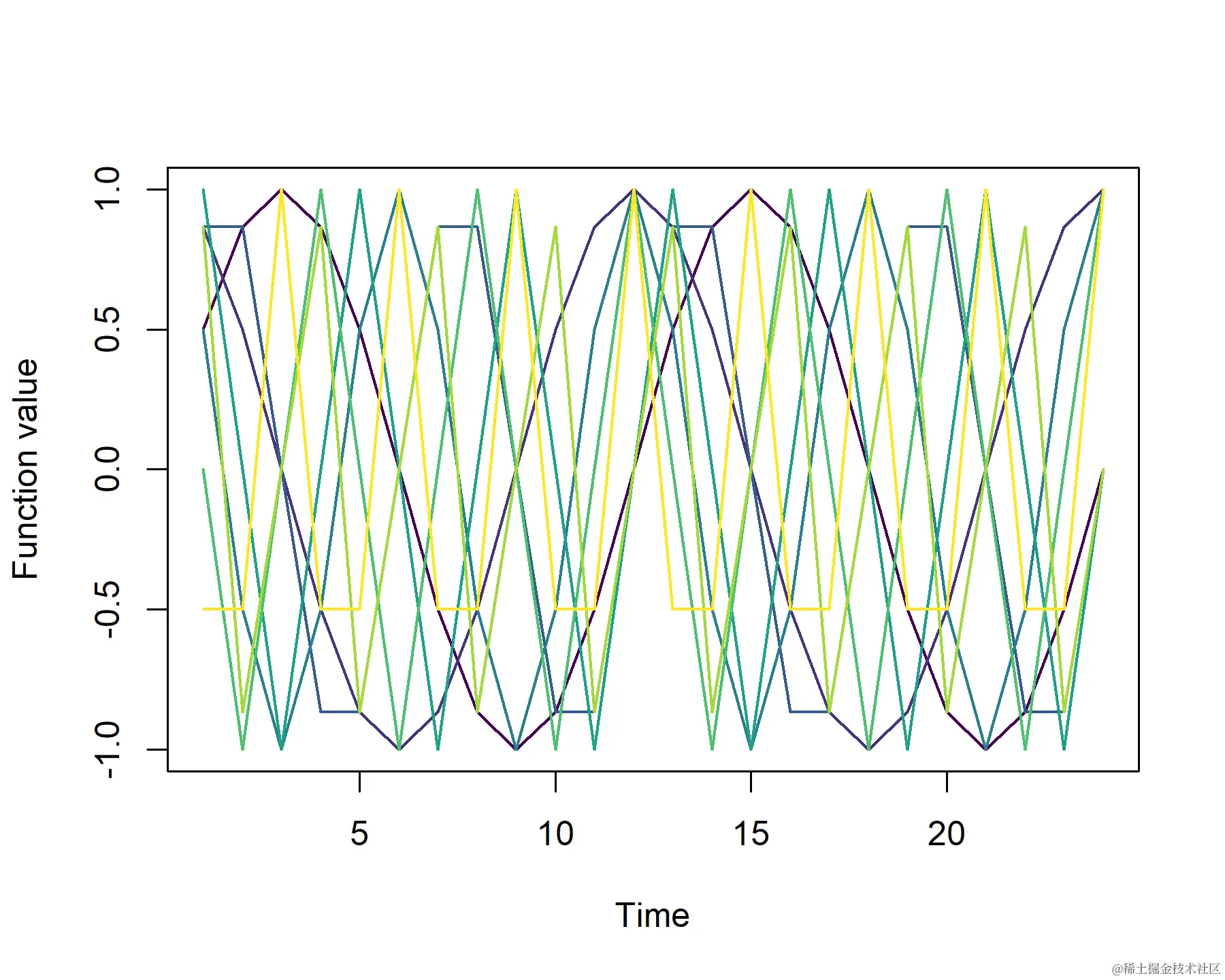 观察这些傅里叶项(针对前24个时间点)有助于我们理解它们如何被视为一种特定的基函数扩展。