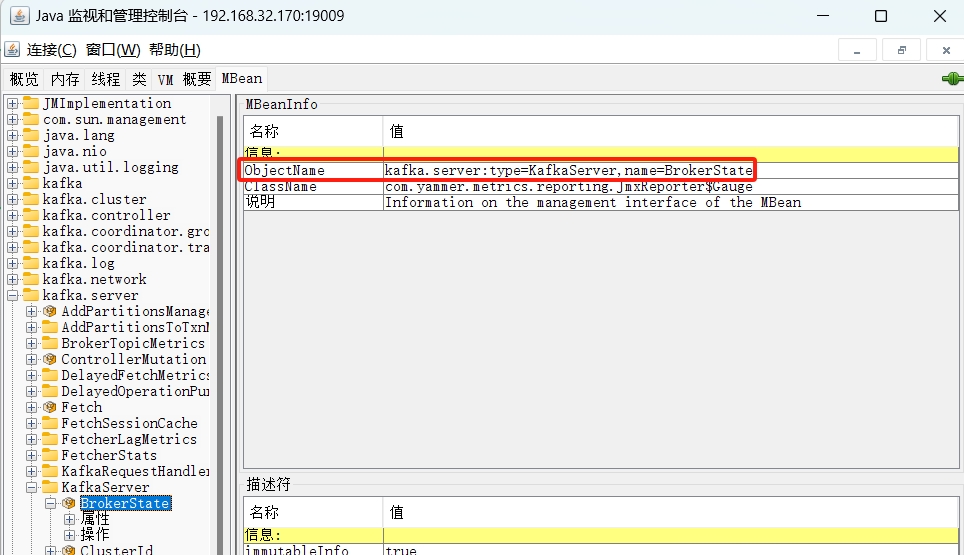 JConsole 上正常连接后就可以在 MBean Tab 页,查看 Kafka 众多暴露的 MBean 从而查看到监控数据。如下为获取 Kafka Broker 状态的 MBean。