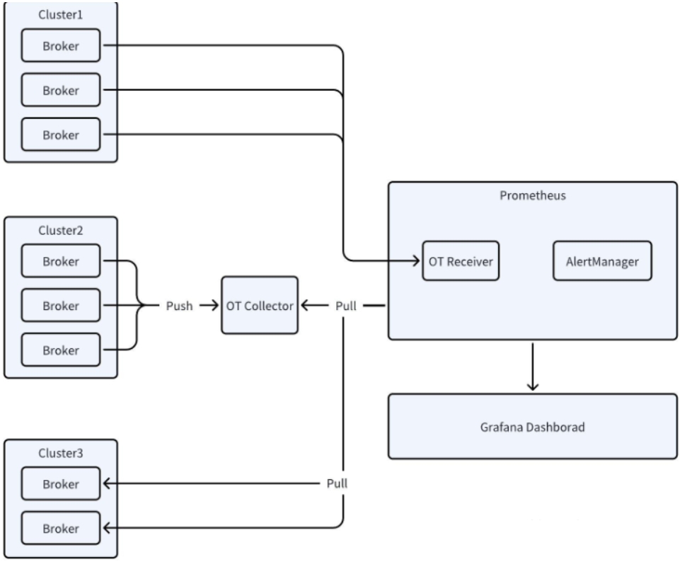 不得不说,这里本人踩了不少坑,最后发现其实很简单。核心是在启动 Broker 和 Contoller 之前,需要在其配置文件中增加 metrics 配置以使得 Broker 和 Controller 能将监控数据以 Push 推送的方式发到 OTel Collector。注意 otlp.endpoint 需改为您实际环境中的 IP 地址即可,因为在 Docker 容器中也是可以直接访问宿主机网络的,这里使用了宿主机的 IP 地址。