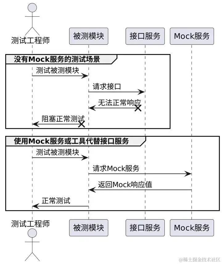当做测试的时候,如果后端某些接口还不成熟、所依赖的接口不稳定或者所依赖的接口为第三方接口、构造依赖的接口数据太复杂等等这些问题的时候,可以用 Mock 的方式先虚拟这些接口返回来代替真正的接口返回。这样可以提高工作效率。
