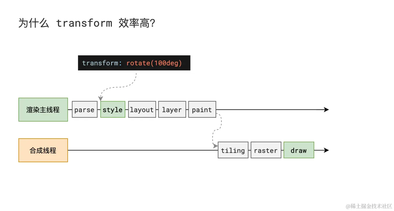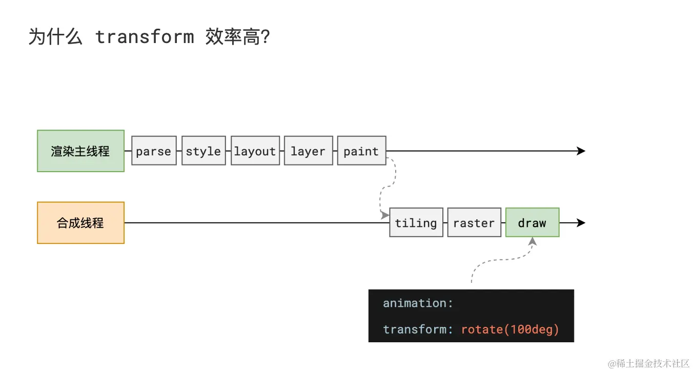 变形发生在合成线程,与渲染主线程无关,这就是 transform效率高的本质原因。