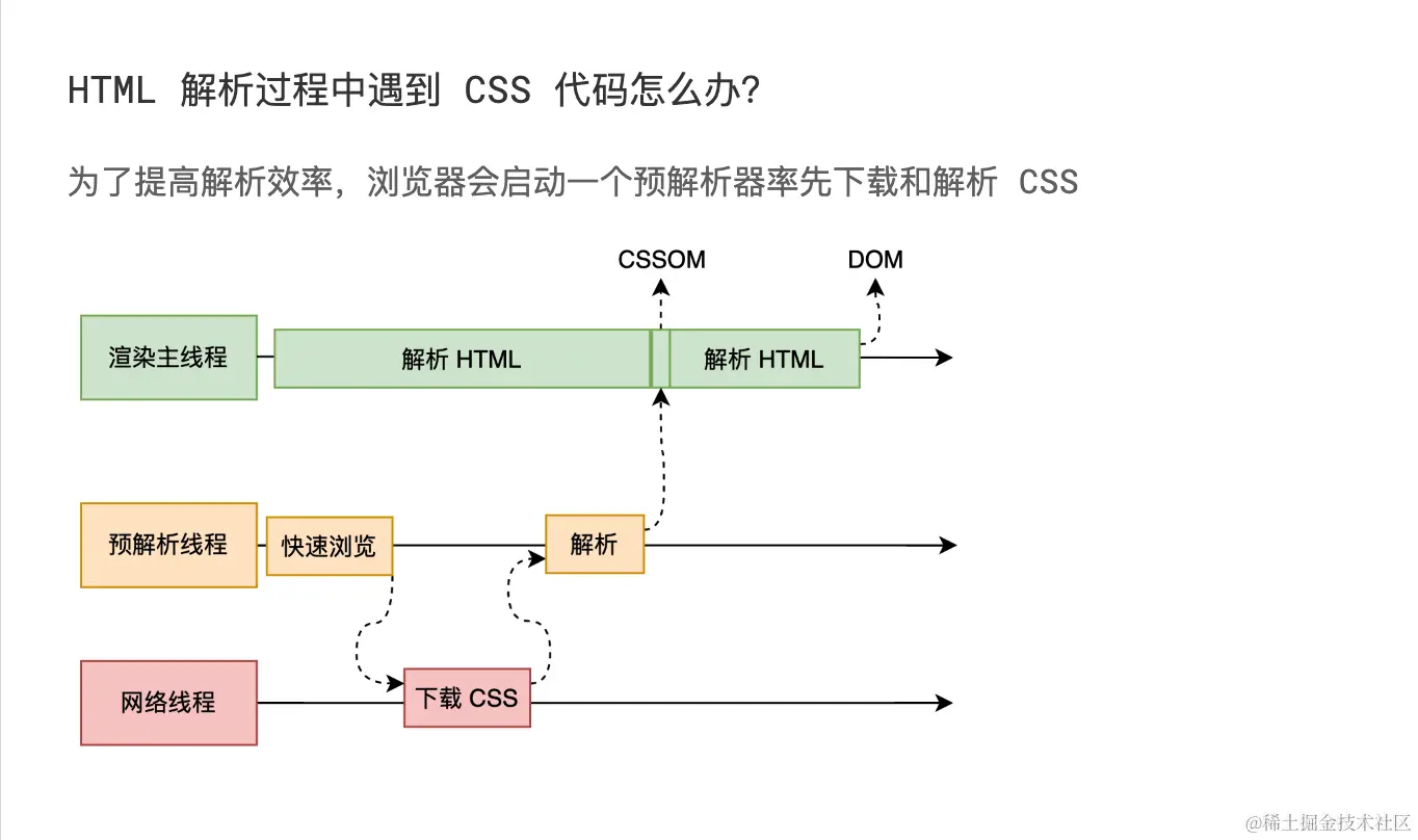 解析过程中遇到 CSS 解析 CSS,遇到 JS 执行 JS。为了提高解析效率,浏览器在开始解析前,会启动一个预解析的线程,率先下载 HTML 中的外部 CSS 文件和 外部的 JS 文件。