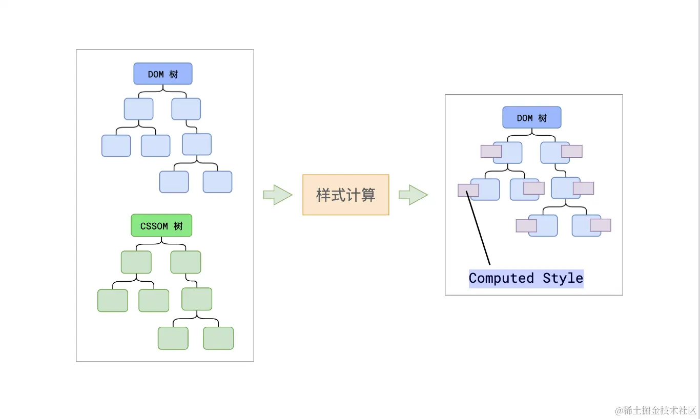 主线程会遍历得到的 DOM 树,依次为树中的每个节点计算出它最终的样式,称之为 Computed Style。