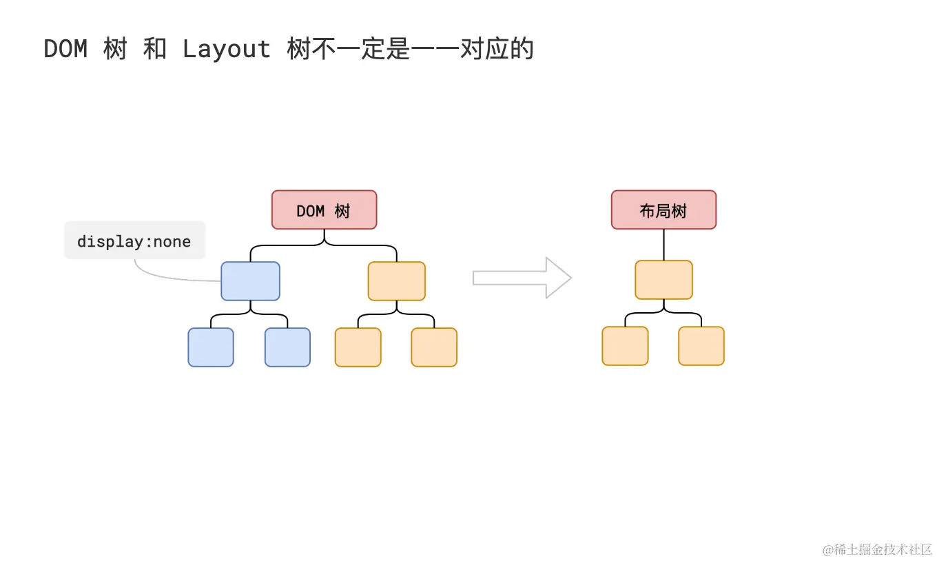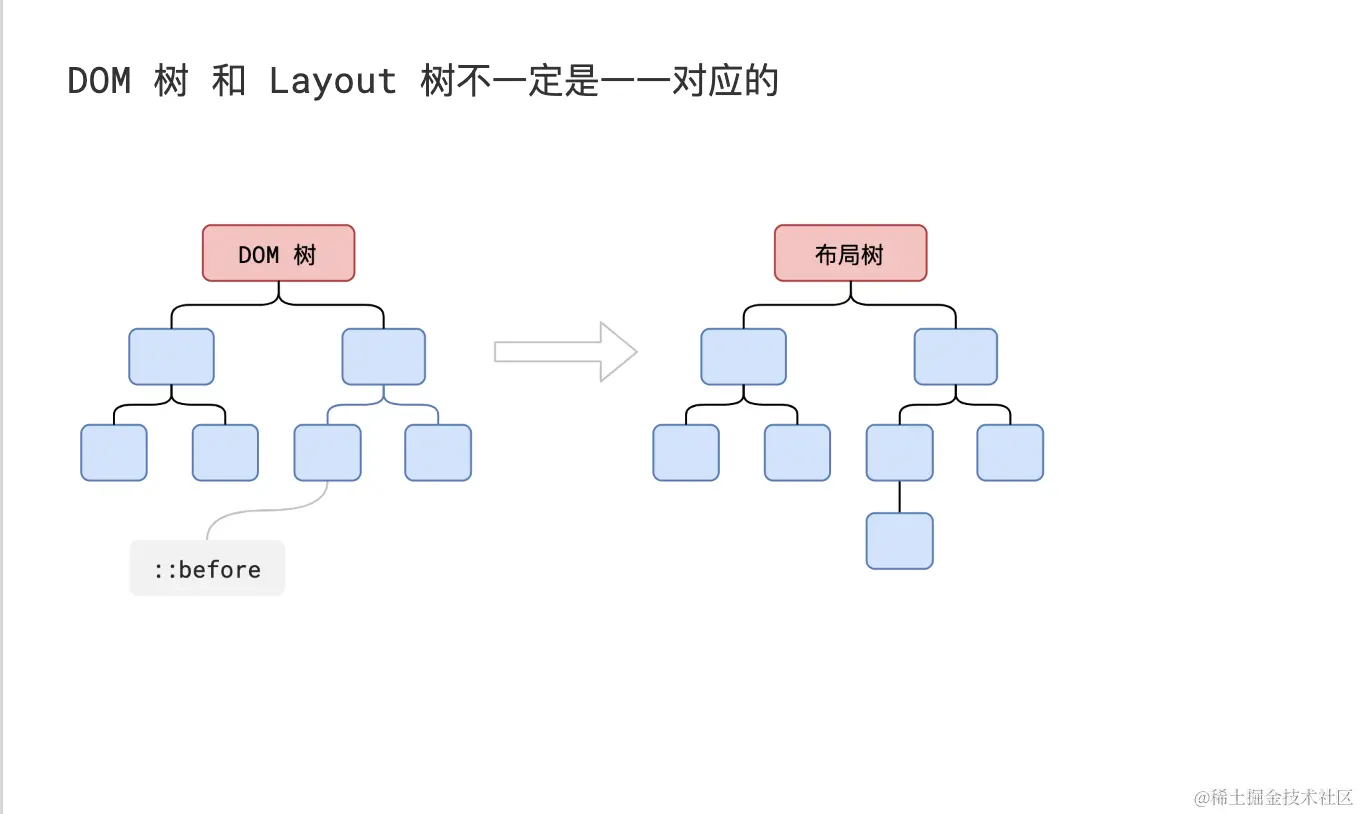 比如 display:none的节点没有几何信息,因此不会生成到布局树;又比如使用了伪元素选择器,虽然 DOM 树中不存在这些伪元素节点,但它们拥有几何信息,所以会生成到布局树中。还有匿名行盒、匿名块盒等等都会导致 DOM 树和布局树无法一一对应。