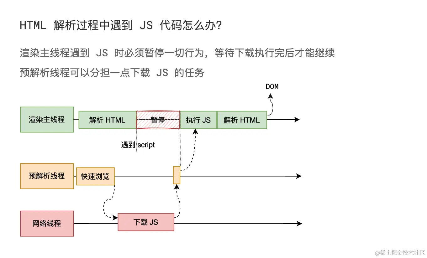 如果主线程解析到 script 位置,会停止解析 HTML,转而等待 JS 文件下载好,并将全局代码解析执行完成后,才能继续解析 HTML。这是因为 JS 代码的执行过程可能会修改当前的 DOM 树,所以 DOM 树的生成必须暂停。这就是 JS 会阻塞 HTML 解析的根本原因。