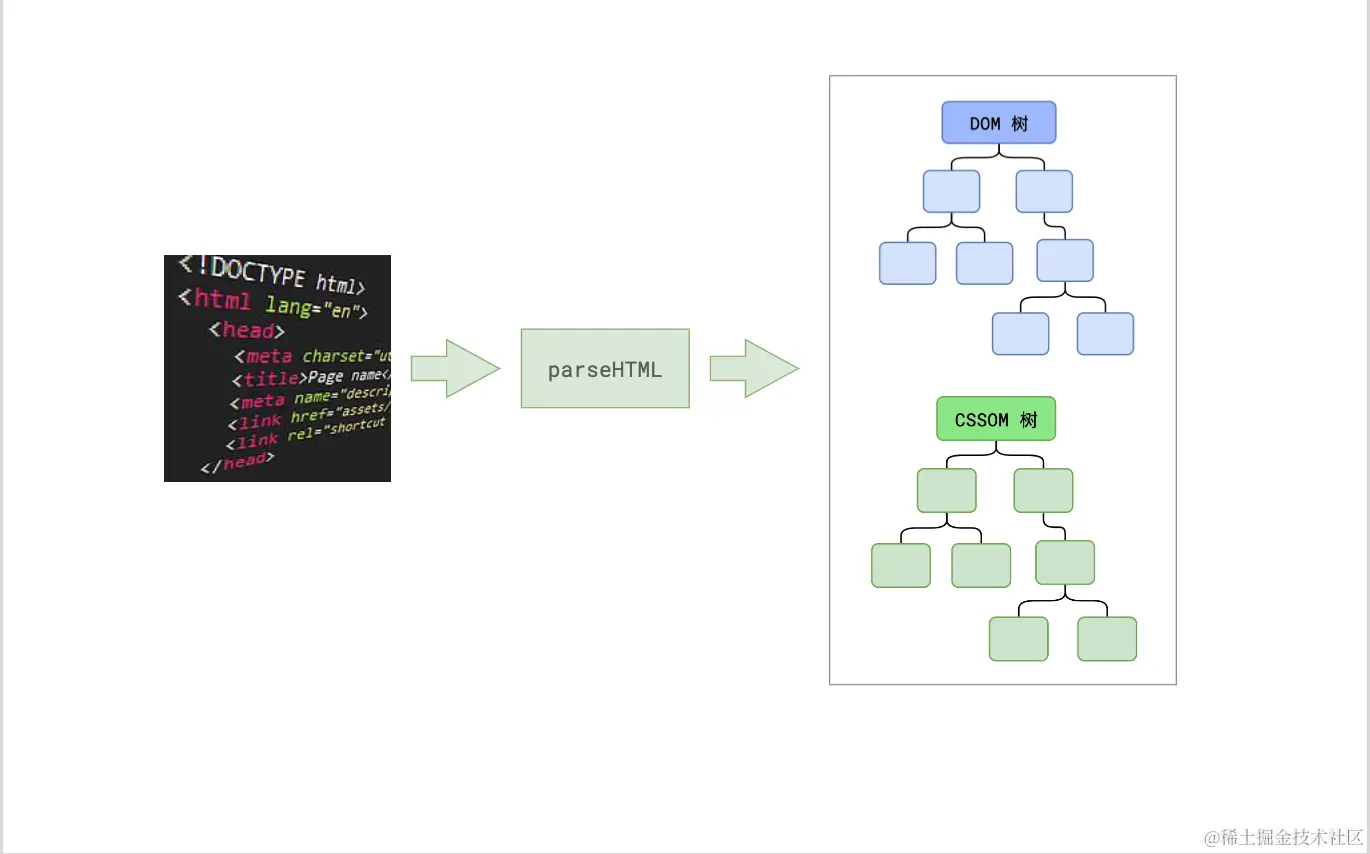 第一步完成后,会得到 DOM 树和 CSSOM 树,浏览器的默认样式、内部样式、外部样式、行内样式均会包含在 CSSOM 树中。