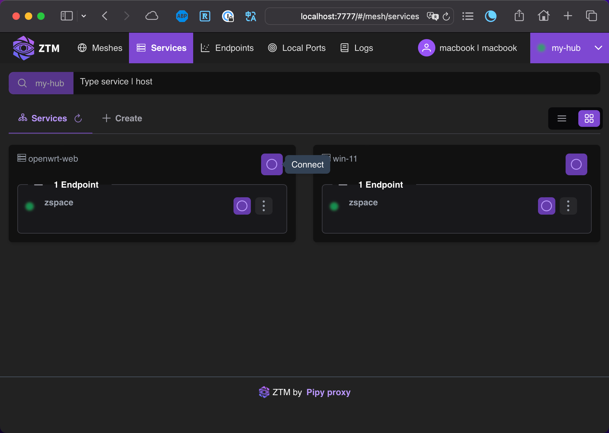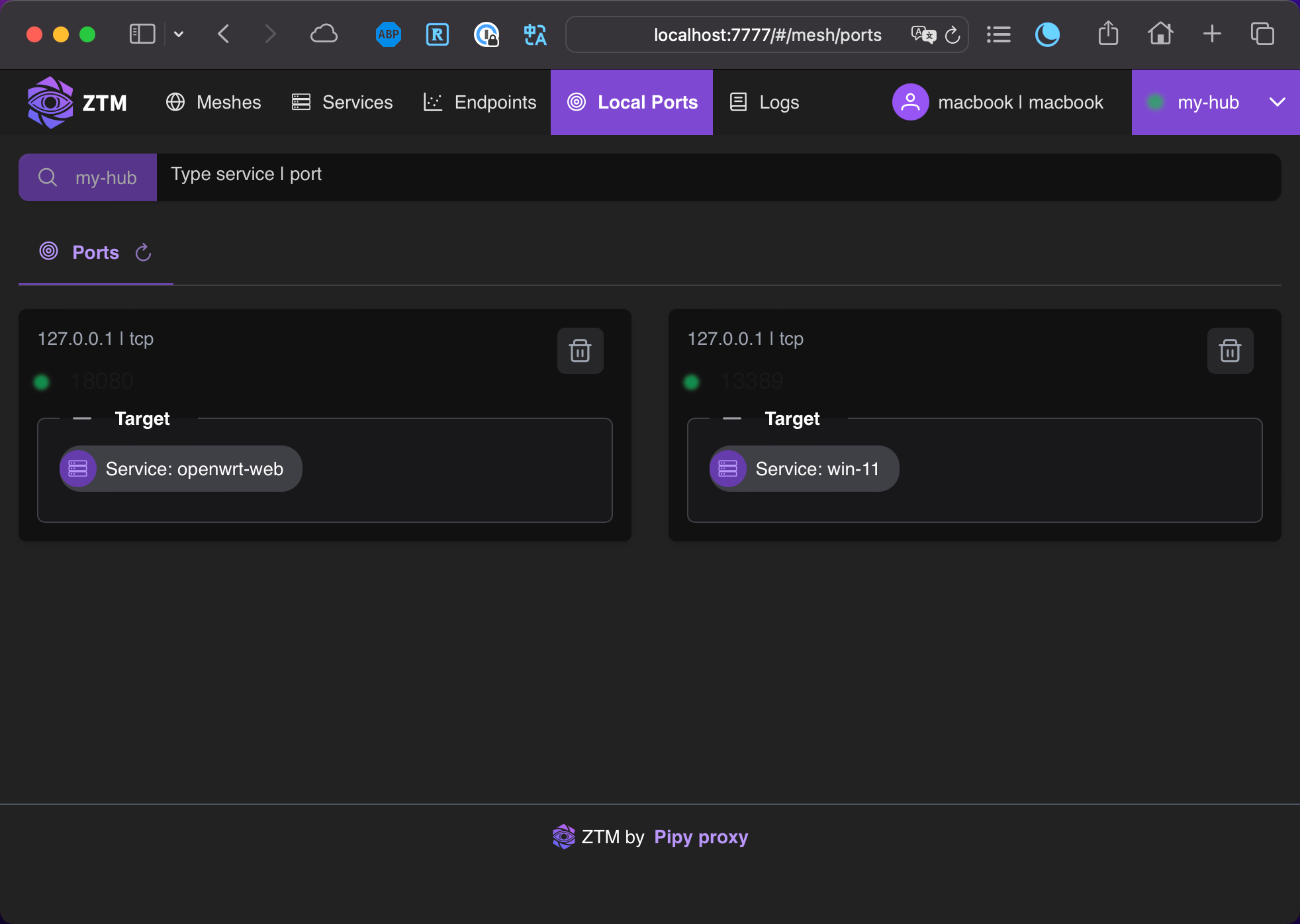 位于另一个网络中的电脑或者任意服务器,同样安装 ZTM Agent,在成功与 Hub 建立隧道后,就可以发现其他 Agent 注册的服务。然后就可以通过创建端口将发现的服务映射到本地。