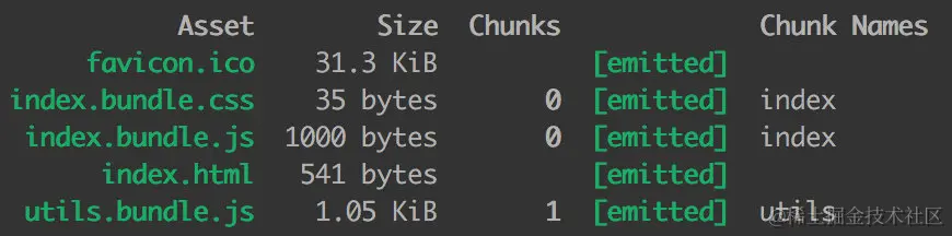 我们可以看出,index.css 和 common.js 在 index.js 中被引入,打包生成的 index.bundle.css 和 index.bundle.js 都属于 chunk 0,utils.js 因为是独立打包的,它生成的 utils.bundle.js 属于 chunk 1。
