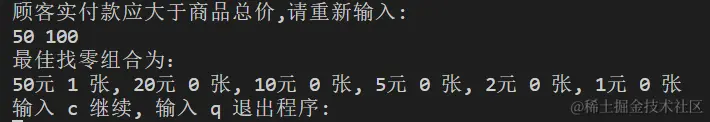 “找零钱最佳组合”程序 : 假设商店货品价格都不大于100元(且为整数),若顾客付款在100元内,现有一个程序能在每位顾客付款后给出找零钱的最佳组合(找给顾客货币张数最少)。 假定此商店的货币面值只包括:50元、20元、 10元、 5元、2元、1元 六种。