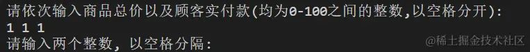 print('请依次输入商品总价以及顾客实付款(均为0-100之间的整数,以空格分开): ')