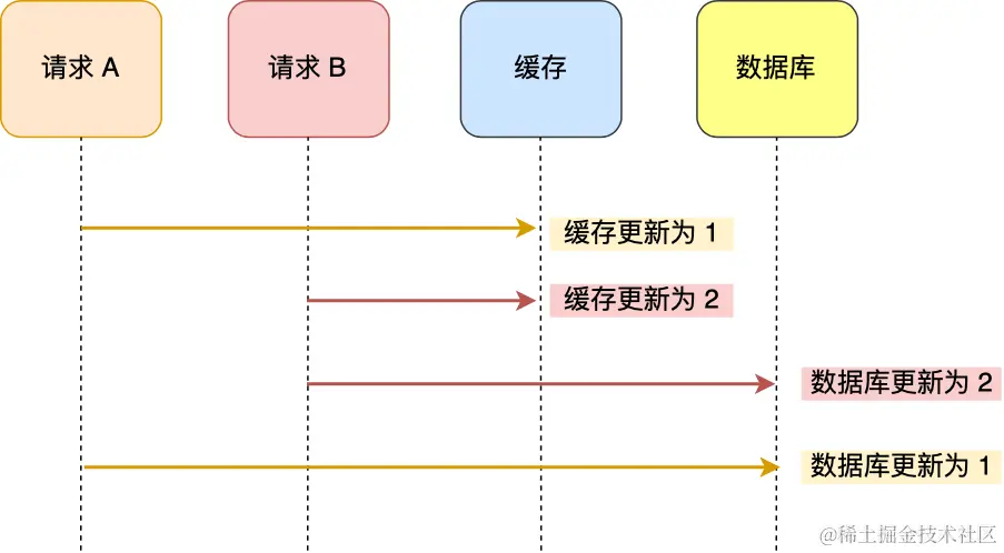 最后数据库的值为2,而缓存的值为1,两者数据不一致。