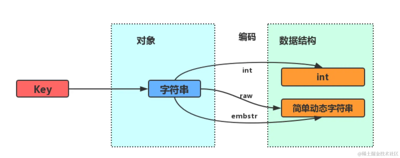 如果字符串对象保存的是字符串,并且字符串大小在44字节内,那么它将以简单动态字符串(SDS)来保存该字符串,并把字符串对象编码设为embstr