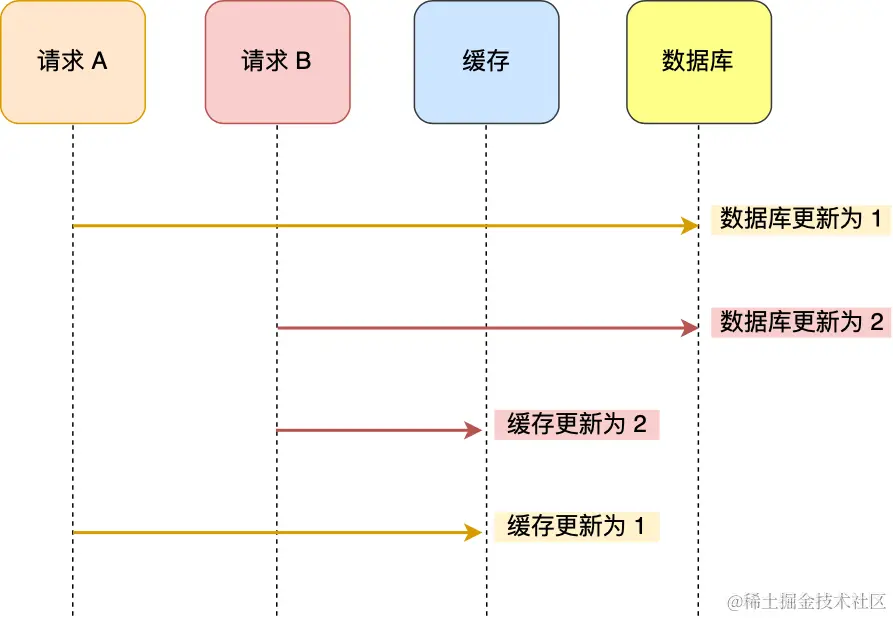 假设某数据在缓存中还不存在,请求B在读到数据库的旧值后,请求A会去更新数据库为新值,然后再删除缓存,然后请求B又去把旧值写入缓存。不过这种可能性在实际中不高,因为缓存的写入速度要远快于数据库的写入。很难出现先等数据库更新完,缓存才被写入。