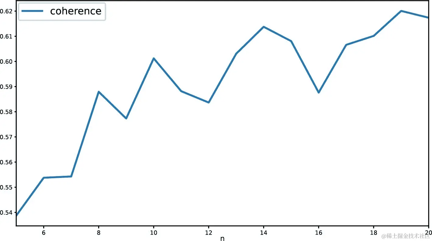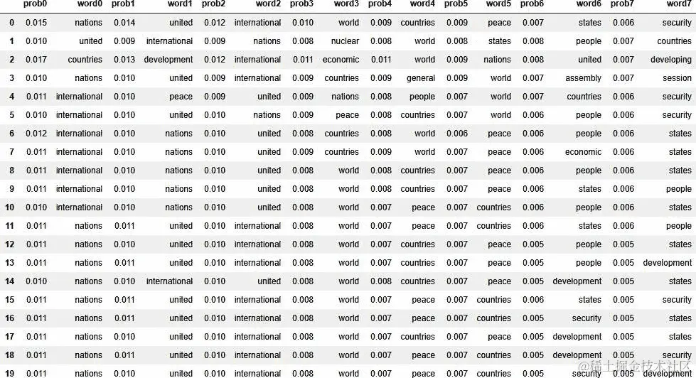 大多数主题都很容易解释,但有些主题很难(如 0、3、8),因为它们包含许多单词,大小相近,但不完全相同。17 个主题的主题模型是否更容易解释?实际上并非如此。连贯性得分更高,但这并不一定意味着更明显的解释。换句话说,如果主题数量过多,仅依赖连贯性得分可能是危险的。尽管理论上,较高的连贯性应有助于更好的可解释性,但通常存在权衡,选择较少的主题可以使生活更轻松。回顾连贯性图表,10 似乎是一个不错的选择,因为它是连贯性得分的局部最大值。