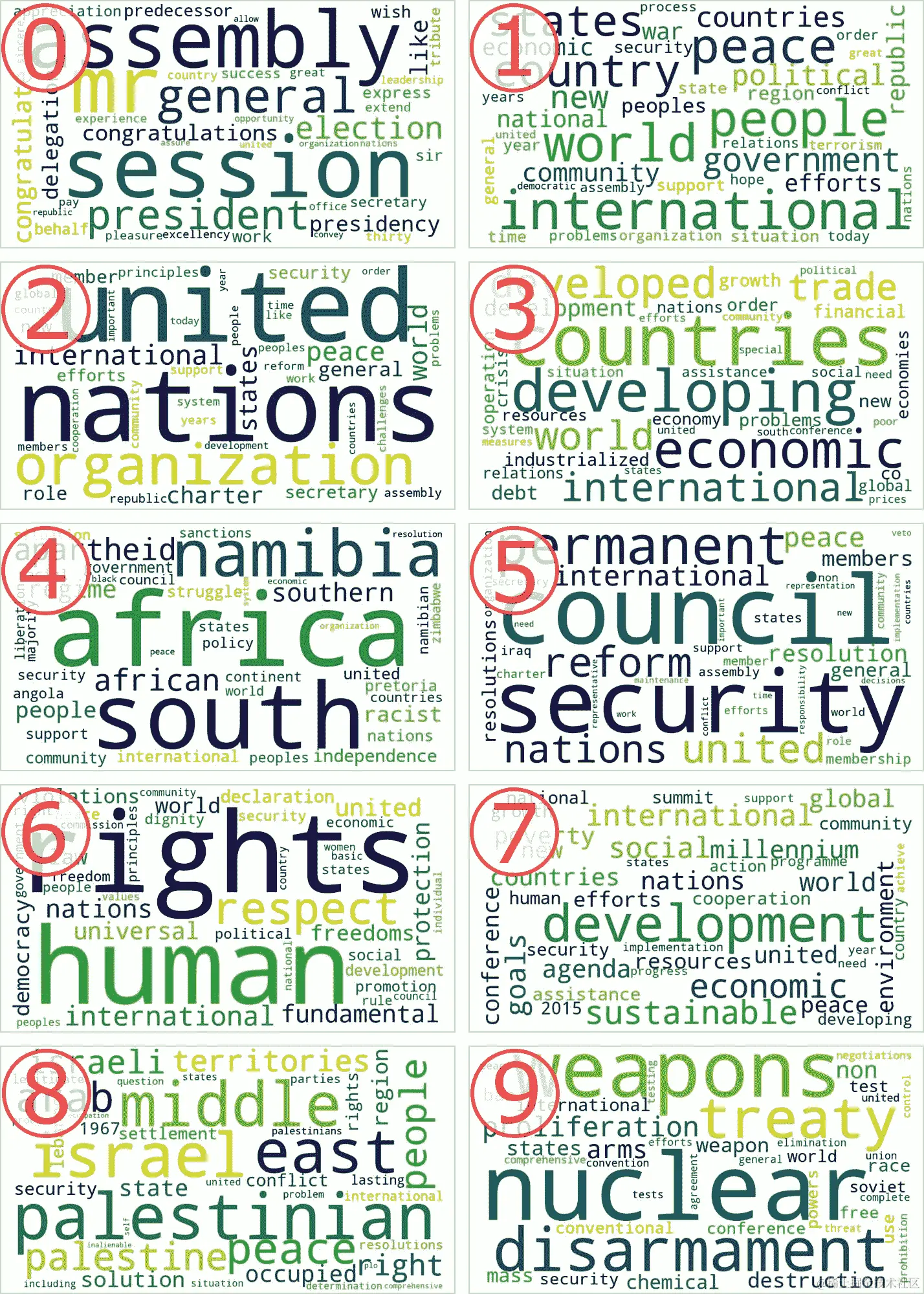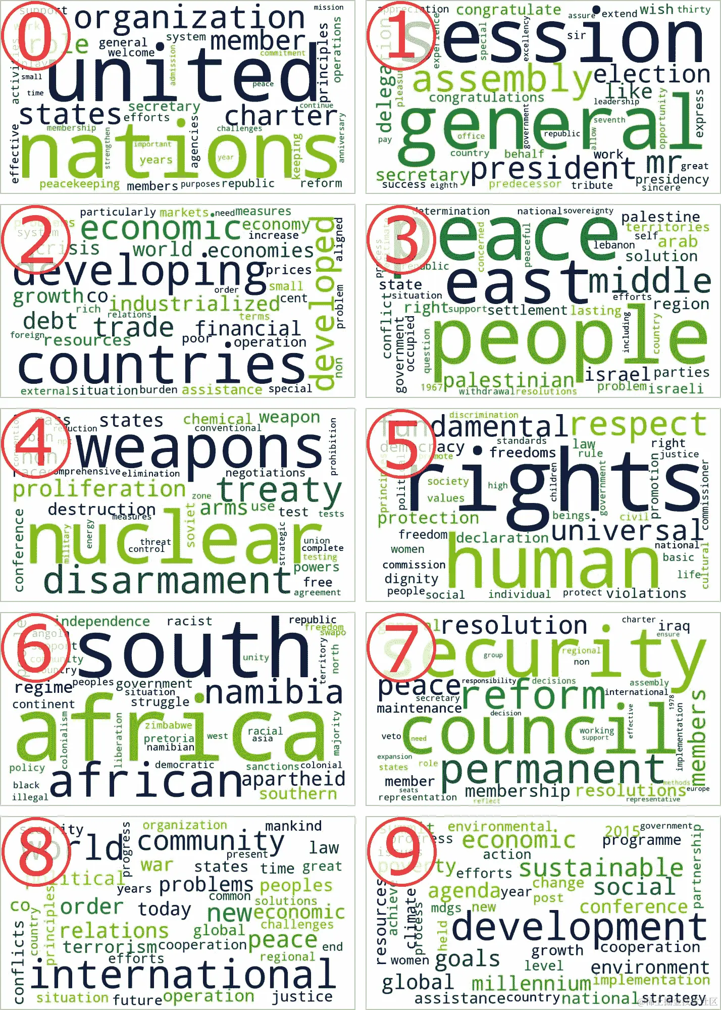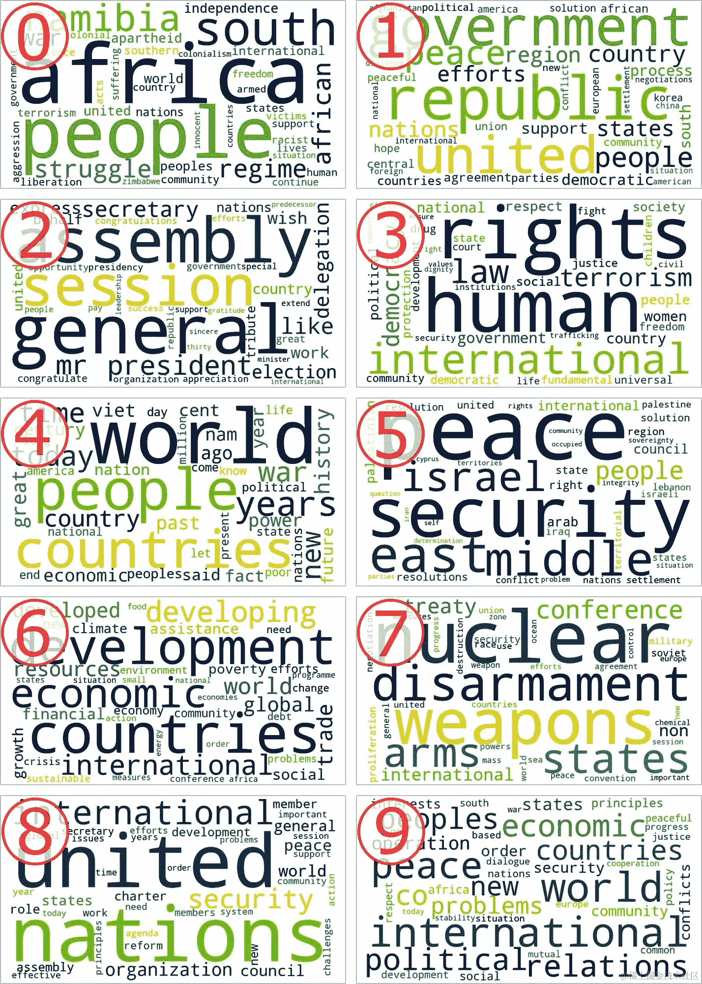 正如你所看到的,结果与各种主题建模方法(幸运地)并没有太大不同;你可能会认出核武器、南非、大会等主题。然而,请注意,聚类更加明显。换句话说,它们有更具体的单词。不幸的是,这并不适用于最大的聚类 1,它没有明确的方向,但有许多具有相似较小尺寸的单词。这是与主题建模相比聚类算法的典型现象。