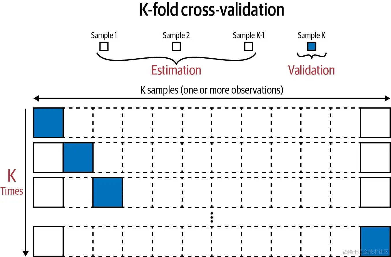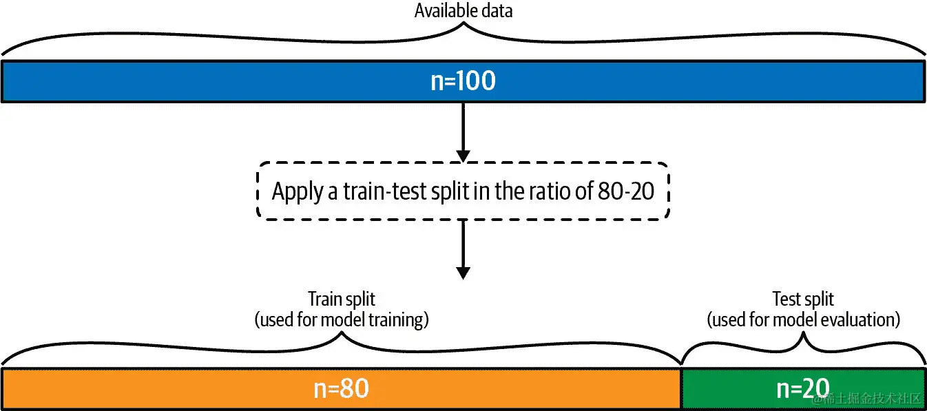在训练监督学习模型的过程中,我们试图学习一个最接近真实世界行为的函数。我们利用训练数据中的信息来学习这个函数。随后,评估我们学到的函数与真实世界行为的接近程度至关重要,因此我们将整个数据集划分为训练集和测试集来实现这一目标。我们通常使用百分比划分数据,其中较大份额分配给训练集。例如,如果数据集有 100 个观测值,并且按 80-20 的比例进行训练-测试分离,则训练集将包含 80 个观测值,测试集将包含 20 个观测值。模型现在在训练集上进行训练,仅使用这 80 个观测值来学习函数。我们将使用这 20 个观测值的测试集来评估学习到的函数。如图 6-2 所示,这一过程进行了说明。