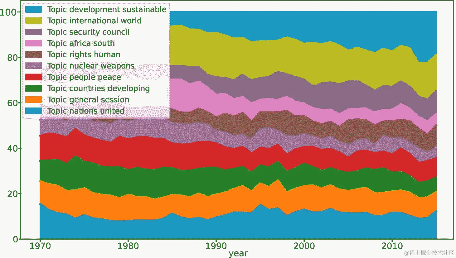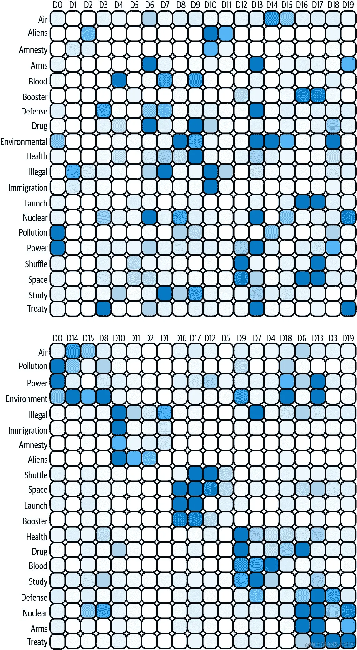在执行主题建模之前以不同方式聚合数据可以导致有趣的变化。正如我们在联合国大会辩论数据集中看到的那样,段落更适合,因为发言者一个接一个地讨论了一个话题。如果您有来自许多作者的语料库,将每位作者的所有文本串联起来将为您提供不同类型作者的人物模型。