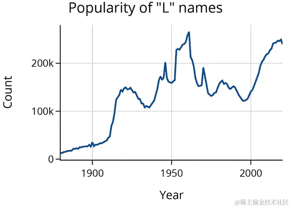 这张图表显示,在 1960 年代,“L”开头的名字很流行,在此后的几十年里有所下降,但自 2000 年以来确实重新流行起来。