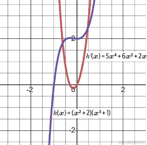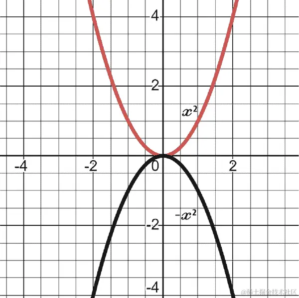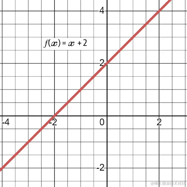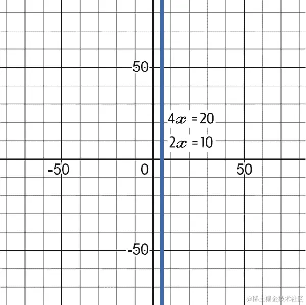 图 4-4 更详细地解释了斜率的概念,x 向右移动了两个点,y 向左移动了两个点。