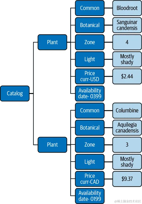 | ‘/catalog/plant/common’ | Two nodes | 从根节点 catalog 沿特定路径向所有植物节点遍历,并在植物节点中的所有共同节点中查找。 |