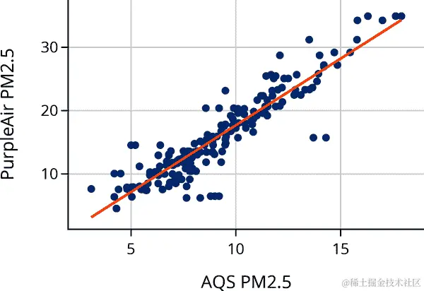 线性模型是在第十二章介绍的,我们在那里使用了由环境保护局操作的高质量空气监测器与邻近的廉价空气质量监测器之间的关系来校准廉价监测器,以进行更准确的预测。我们重新审视那个例子,以使简单的线性模型概念更加具体。