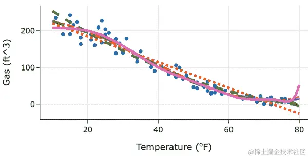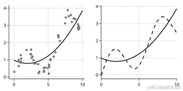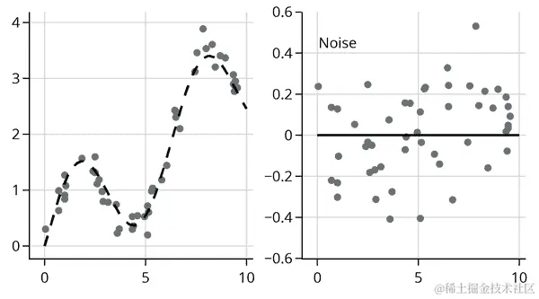 假设ϵ 表现为没有趋势或模式、方差恒定且彼此独立的随机误差。模型中的 信号 是函数 g ( ) 。数据是 ( x i , y i ) 对,我们通过最小化均方误差来拟合模型: