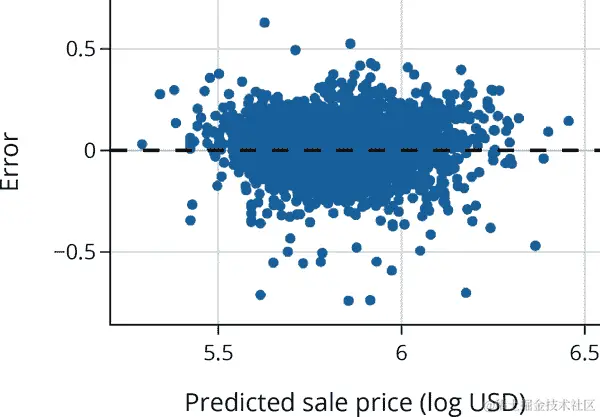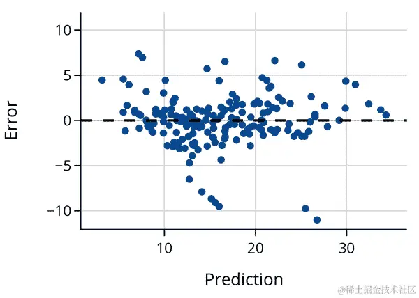 早期的误差图针对拟合值给出了拟合质量的视觉评估。(这种图称为残差图,因为误差有时被称为残差。)一个良好的拟合应该显示一群点围绕着 0 的水平线,没有明显的模式。当出现模式时,我们通常可以得出简单线性模型并没有完全捕捉到信号的结论。我们之前看到残差图中没有明显的模式。