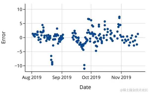 看起来在八月底和九月底附近有几天数据远低于预期。回顾原始散点图(以及第一个残差图),我们可以看到两个小的水平点簇在主要点云下方。我们刚刚制作的图表表明,我们应该检查原始数据以及关于设备的任何可用信息,以确定这些天是否正常运行。
