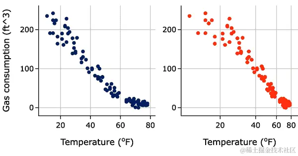 原始的成对测量散点图显示,PurpleAir 记录往往比更准确的 AQS 测量值要高得多。事实上,我们简单线性模型的方程的斜率约为 2.1。我们解释斜率意味着 AQS 监视器测得的 1 ppm 的变化平均对应于 PA 测量的 2 ppm 的变化。因此,如果一天 AQS 传感器测量 10 ppm,第二天它高出 5 ppm,即 15 ppm,那么我们对于下一天的 PA 测量的预测将增加2 × 5 = 10 ppm。