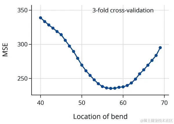 为了拟合模型,我们寻找能够给出最小平均损失的斜率和截距;换句话说,我们最小化均方误差,简称 MSE。我们称截距和斜率的最小化值为θ ^ 0和θ ^ 1。