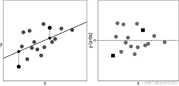 图 15-1. 左侧是( x i , y i )对的散点图和我们用于从x估计y的直线。具体的两个点用方块表示,它们的估计值用菱形表示。右侧是误差的散点图:y i − ( θ 0 + θ 1 x i )。