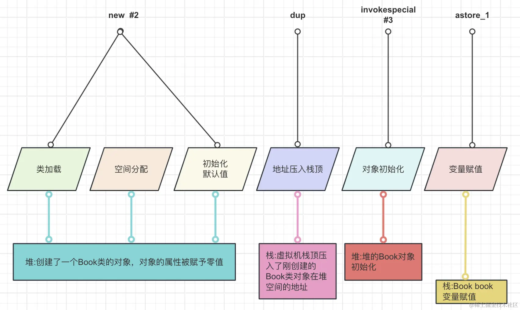 这一指令用于复制栈顶的元素。由于上一行代码创建了一个新的Book对象并将其引用压入操作数栈,这条指令会将这个引用复制一份,这样栈顶就有两个相同的对象引用了。