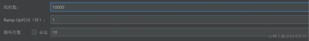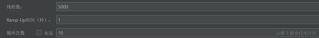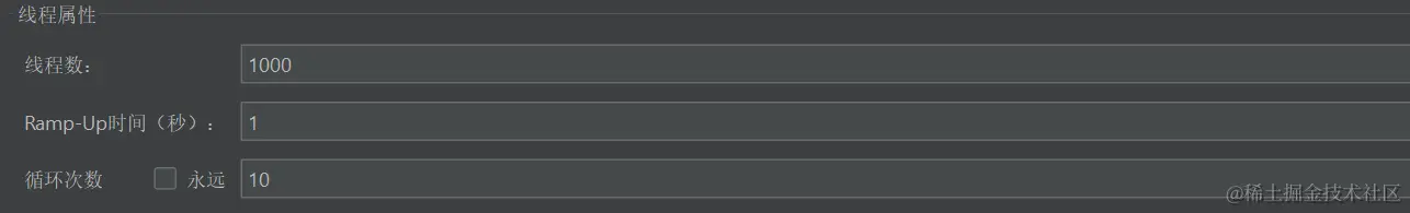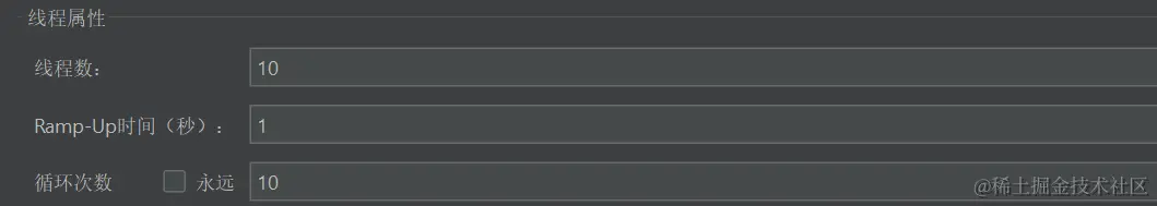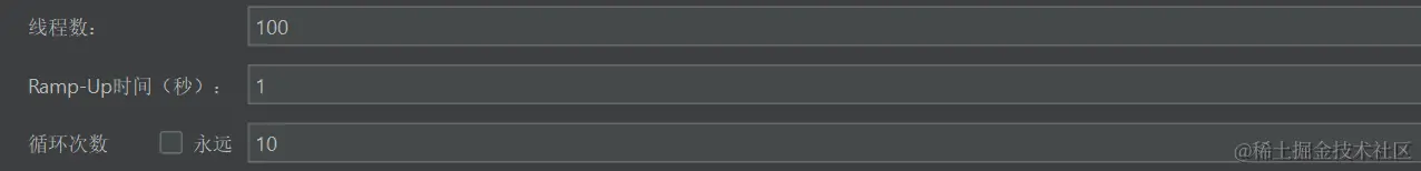 每个线程发送请求的次数。如果线程数为10,循环次数为10,那么每个线程发送10次请求。总请求数为10*10=100。