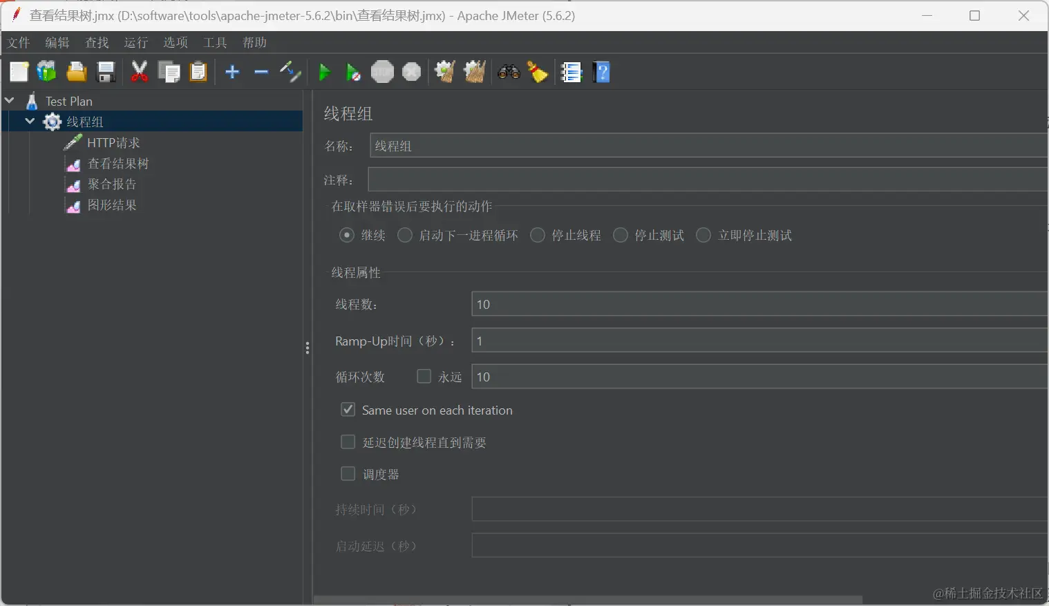 Ramp-Up Period(in seconds)准备时长:设置的虚拟用户数需要多长时间全部启动。如果线程数为10,准备时长为2,那么需要2秒钟启动10个线程,也就是每秒钟启动5个线程。