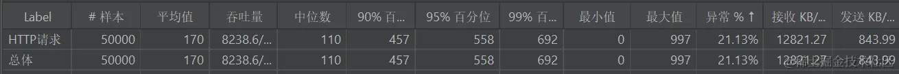 本次测试平均响应时间为0,服务器表现很好,继续增加请求数量。