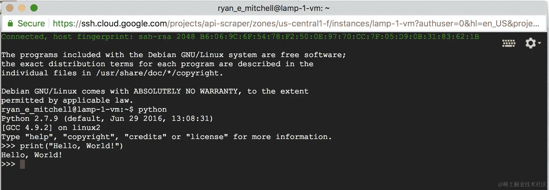 图 20-1. 来自正在运行的 Google Cloud 平台 VM 实例的基于浏览器的终端