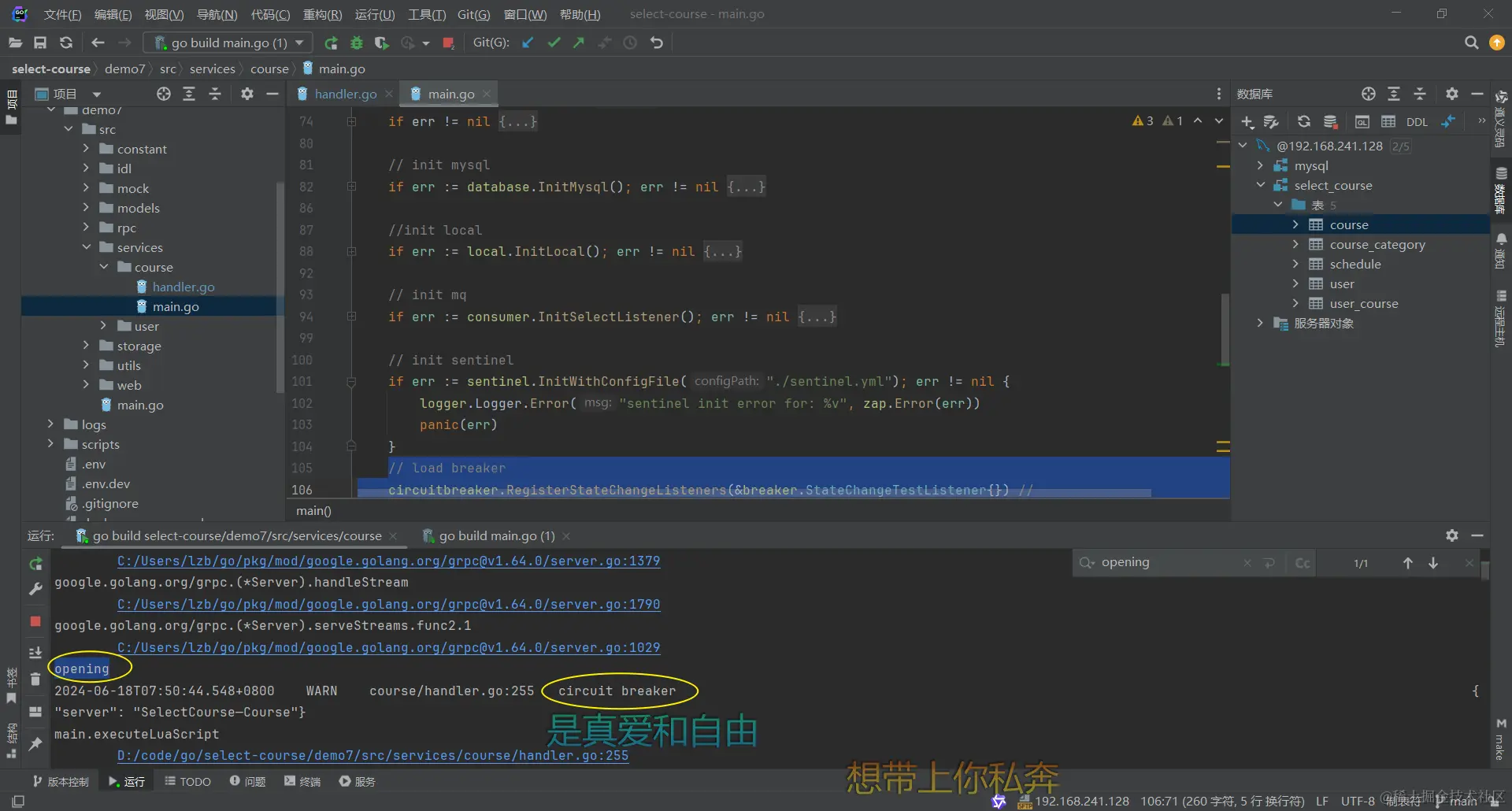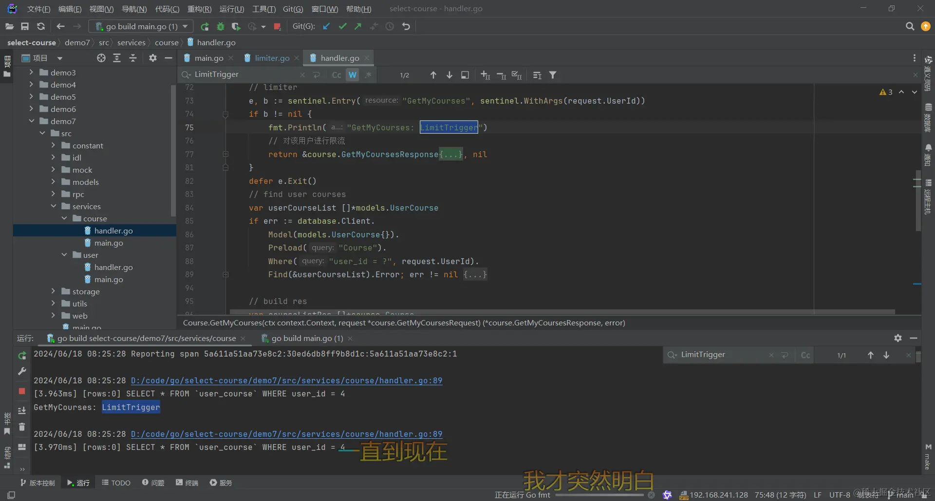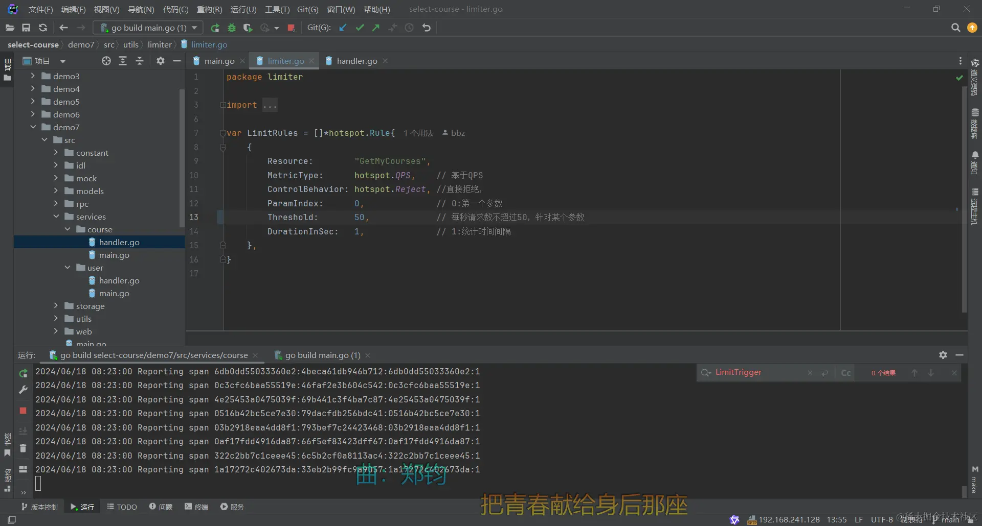 值得注意的是sentinel.WithArgs(request.UserId),这里需要携带流控参数,参数类型为any,也就是说可以传入一个结构体,结构体可以包含用户ID和课程ID。那么可以说精确到针对于某个用户选的课程请求进行流控了。参数可以传多个,但是需要匹配到刚刚设置的规则的ParamIndex进行参数流控