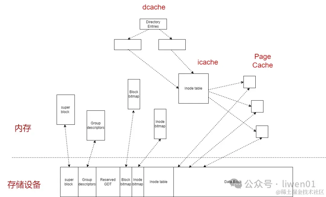 在实际使用的时候,情况会更加地复杂,因为系统为了提升文件系统的读写检索性能,在挂载文件系统的时候,系统会将文件系统的元数据缓存到内存上。如下图《图1.1 内存与存储结构》