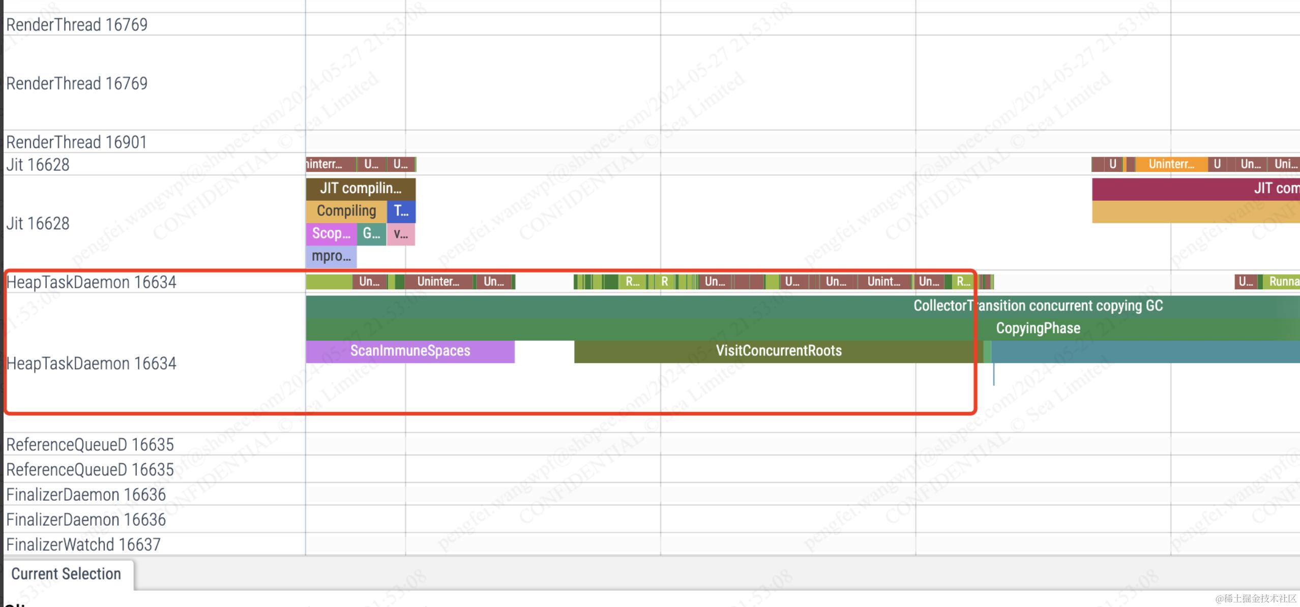 进一步查看和主线程竞争锁的线程16634对应的是HeapTaskDaemon线程,也就是执行后台并发GC的线程,我们从下图的Trace也可以看到正在执行并发拷贝GC。虽然是后台GC,但由于某些阶段还是需要暂停一些线程,因此还是会对主线程产生影响。