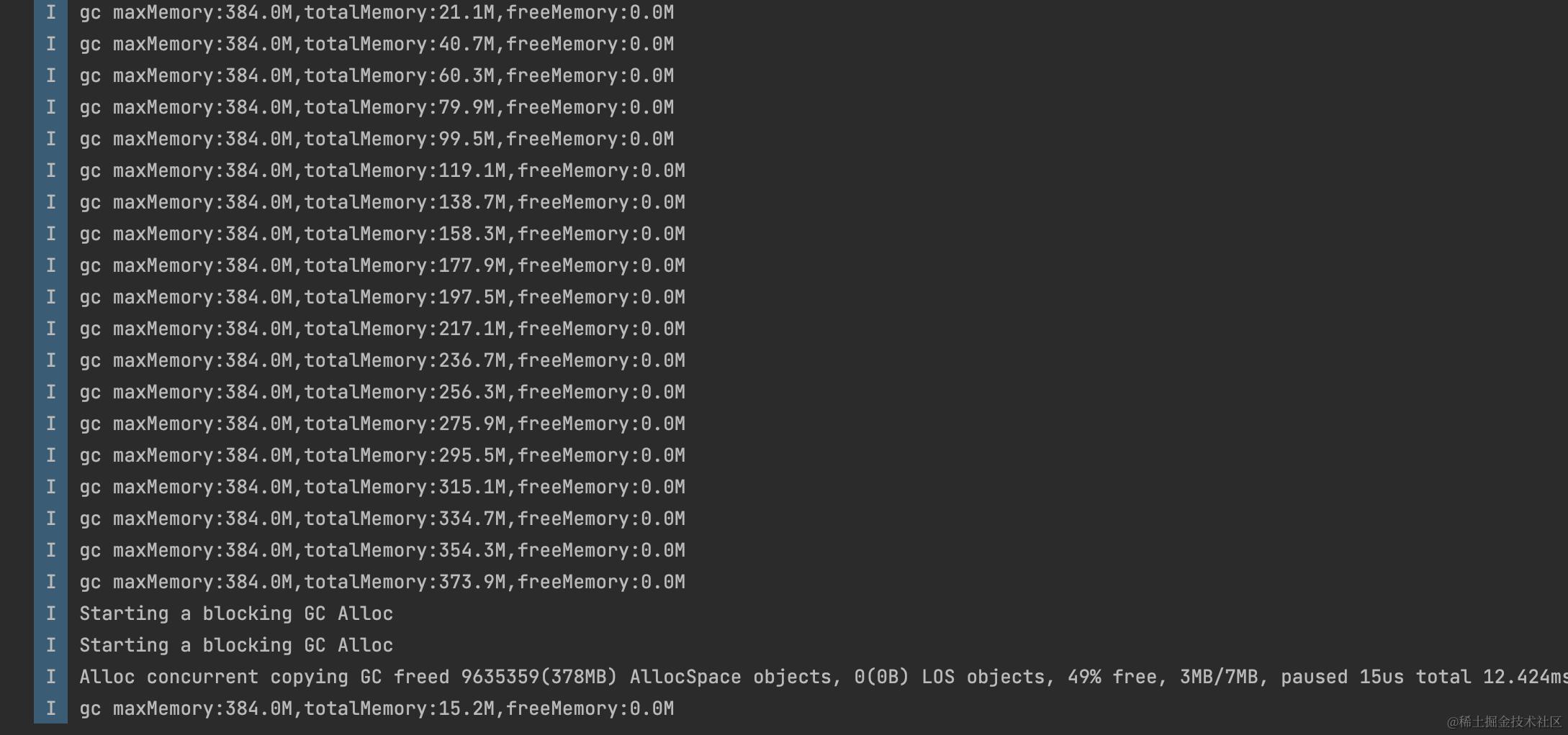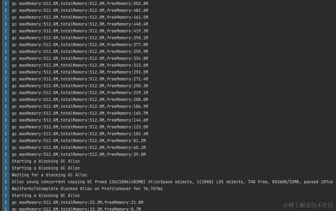 在Android 10上可以看出totalMemory一直和maxMemory相等,好像直接起到了直接将totalMemory扩到maxMemory的作用,当freeMemory将要使用完时候触发才触发 Alloc GC.这也验证了上文中Android 10启动时候自己做了GC抑制,就是直接将max_allowed_footprint_调整为growth_limit_,并将 concurrent_start_bytes_ 调整为max_allowed_footprint_/2 来达成 GC 抑制的目的, 我们这里抑制阻塞并发GC任务执行,所以对应的参数没有机会恢复