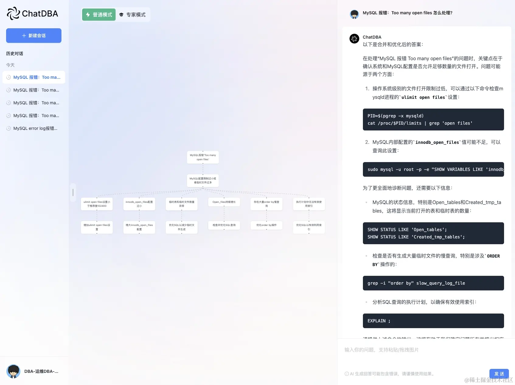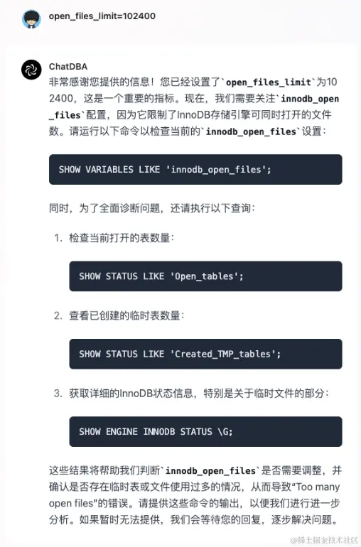 这里 ChatDBA 要求输入一些系统的基本情况,因为该报错很有可能是由于文件描述符数量引起的,要求输入的信息分别为: