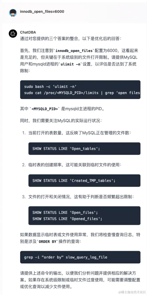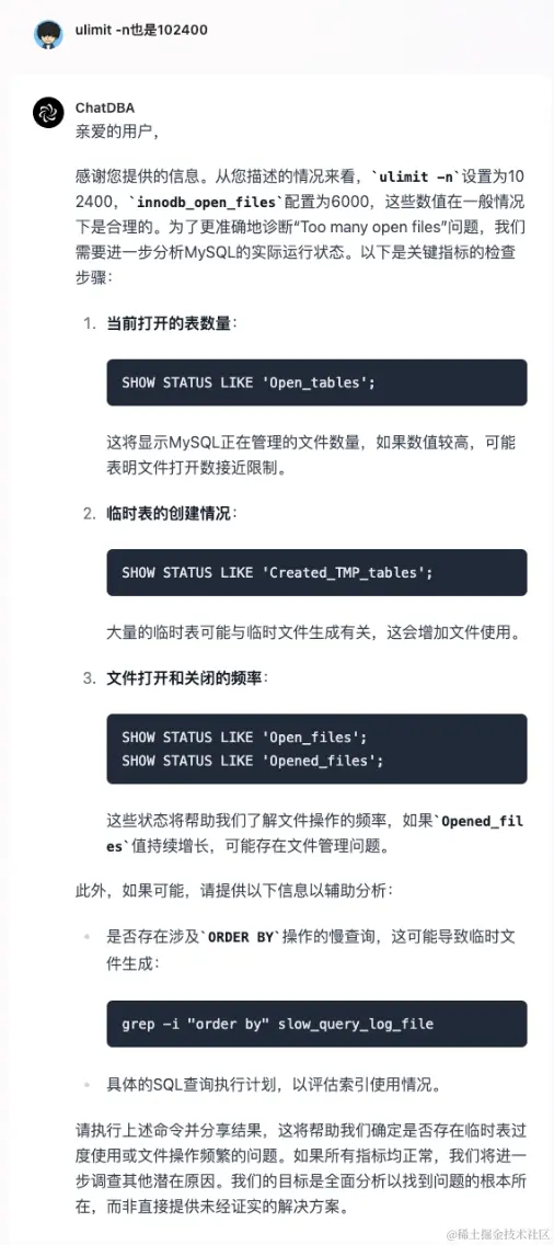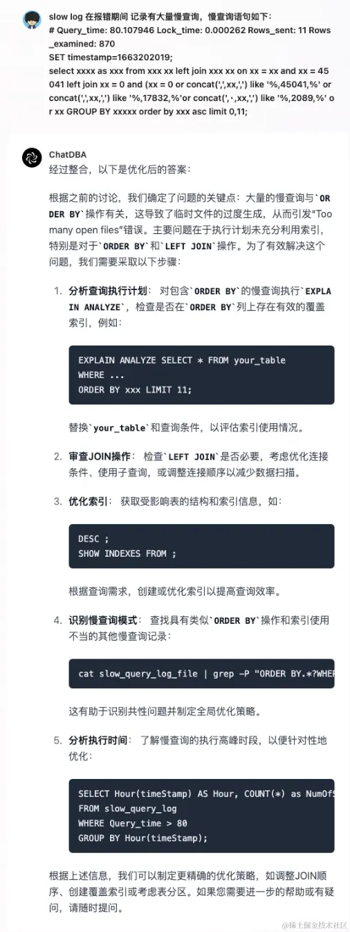 ChatDBA 接下来推测是慢查询导致的临时文件过多,所以要求我们输入对应的慢查语句。