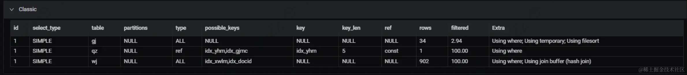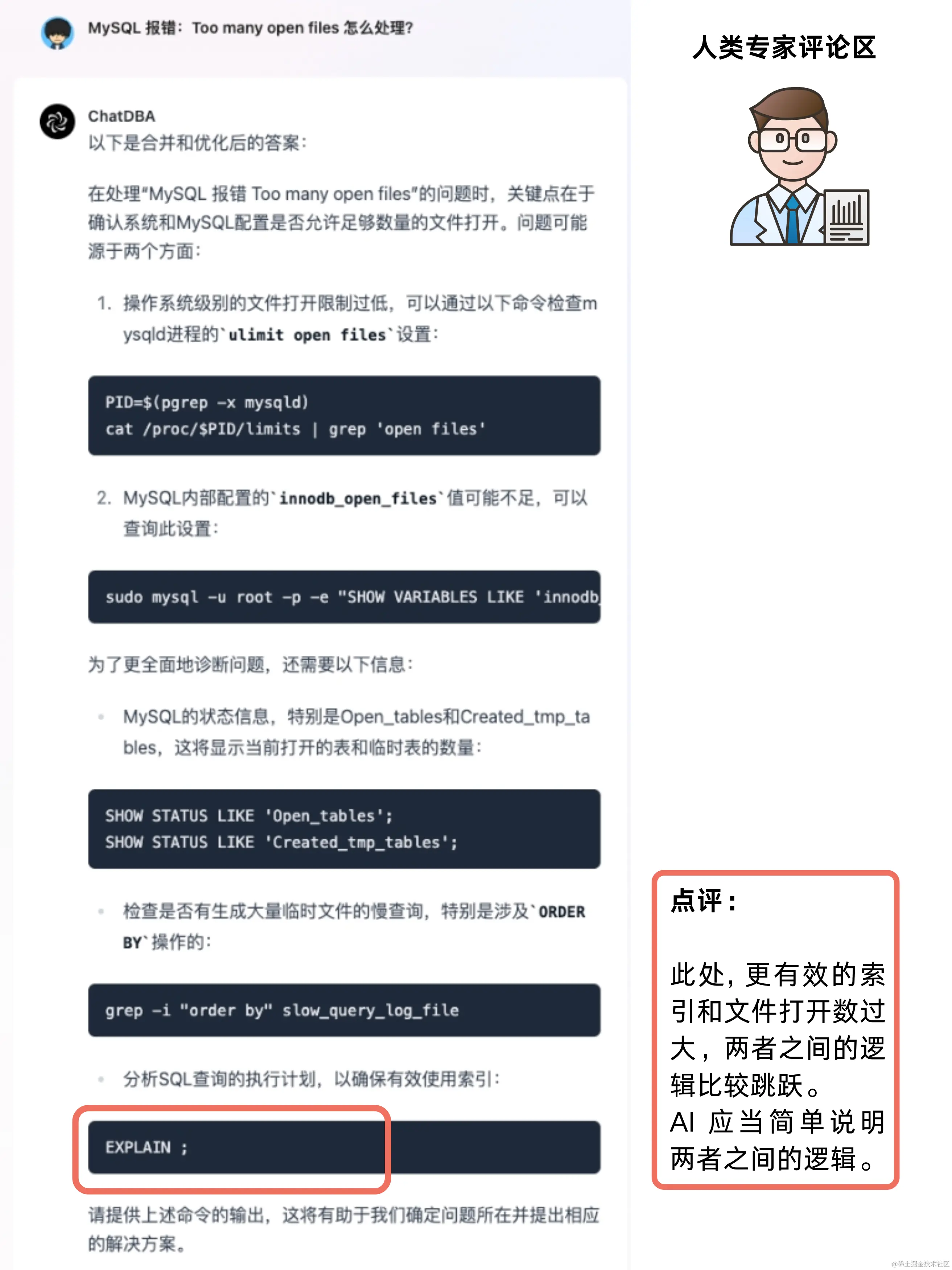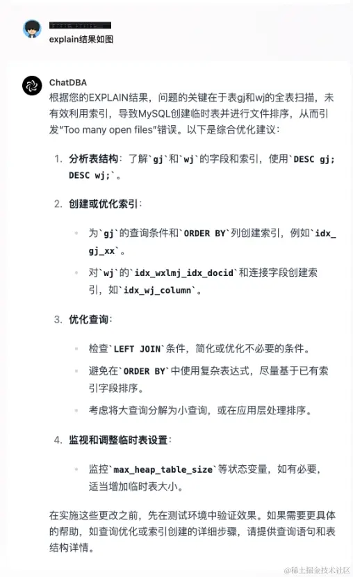 我们将 EXPLAIN 的结果截图给到 ChatDBA 后,发现其根据截图内容推测出了问题关键,并且给到了对应的解决方案。